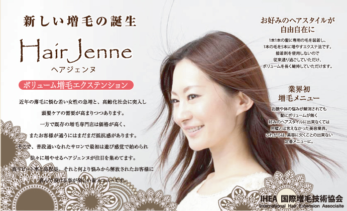 ヘアジェンヌ(Hair Jenne)は自然に、おしゃれに増毛!髪の毛1本に最高級品質のエクステを装着する新しい増毛法です。